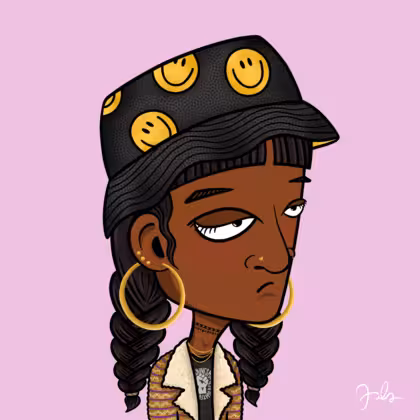 Collection Depressed Citizens Artist Juls Description ART. No team, no project, no future. Depressed Citizens is an urban & existential Art expression on Ordinals. In a parallel universe, "THEI" control us. DC unites against toxic society, encouraging critical thinking. 100% hand made collection that took Juls more than 6 months of daily work. Name Citizen#1786 Origin African descendant Gender Woman Necklace Gold layered necklace Hat Smiley bucket hat Mustache Beard No beard Glasses No Glasses Earrings Ball earrings trio Hair Style Double braids with bangs Clothes BLM women shirt Tattoo No Tattoo Star Background Without stars